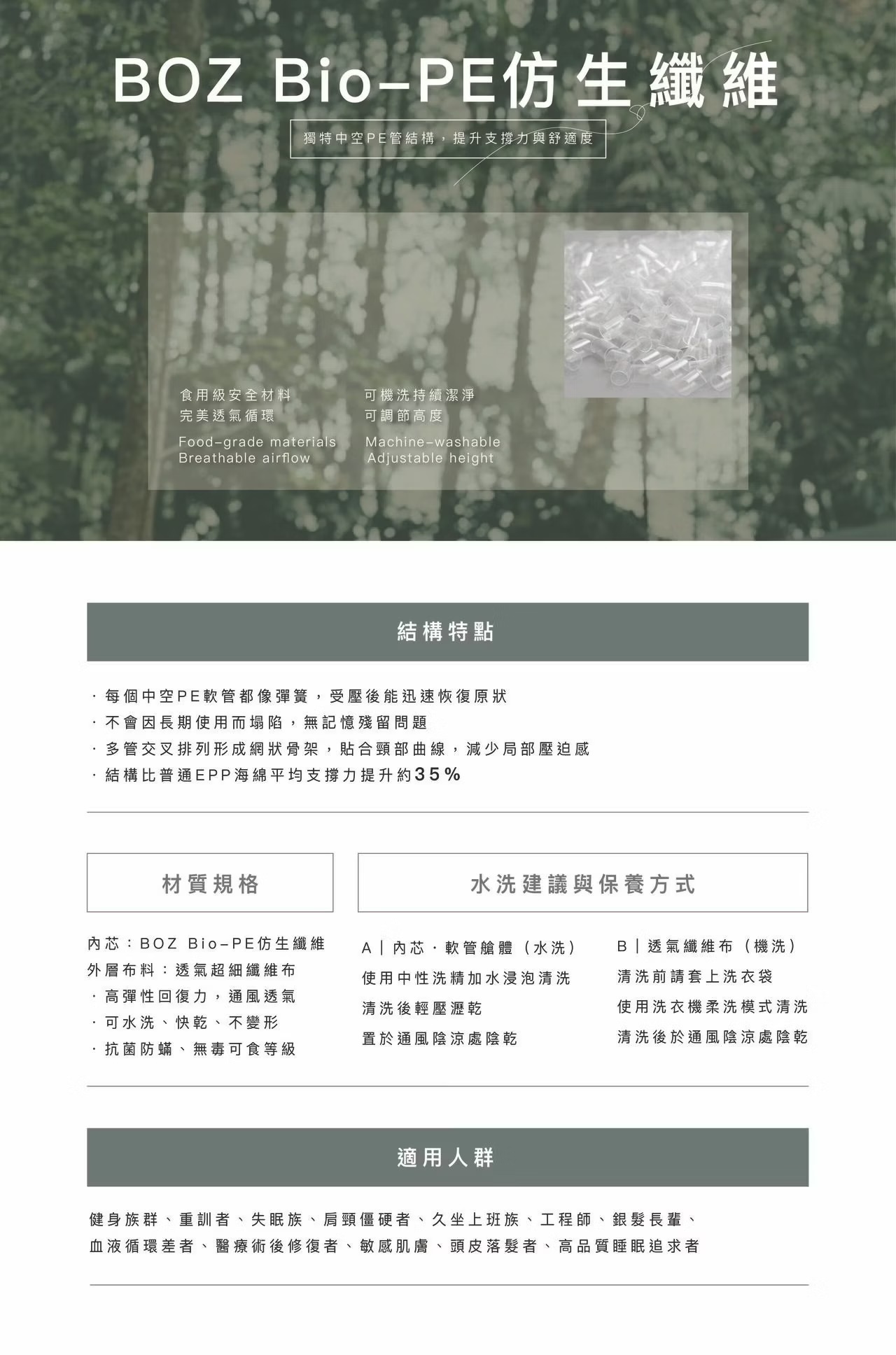 每顆枕頭皆附贈:250g BOZ Bio-PE 仿生纖維、專用洗衣袋
